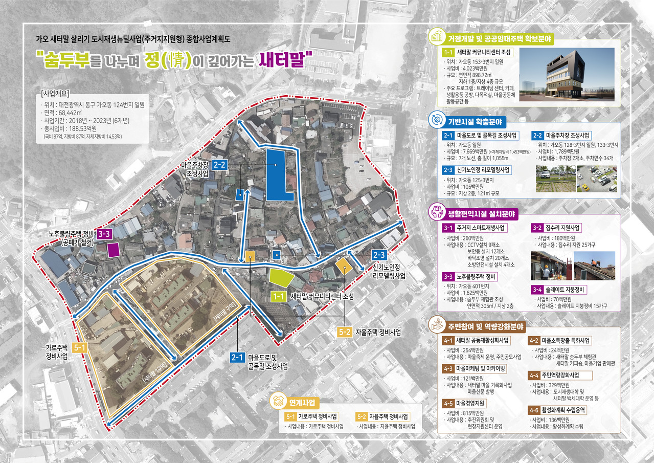 2017년 도시재생사업 주거지 지형으로 선정되어 2023년까지 5년간 178억 원 규모로 진행되었습니다. 거점시설로 새터말의 특화사업인 ‘두부 및 숨두부 체험관’을 지었고 마을주민 교육, 문화 공간으로 ‘정말센터’를 지어 체험과 교육 등 여러 사업을 하고 있습니다. 또한 지역 주민의 주거환경을 위해 마을도로 및 골목길은 재정비하였으며 집수리 사업으로 낙후된 주택을 새롭게 재탄생시켰습니다. 또한 마을 어르신들은 리모델링된 경로당에서 편안하고 즐거운 시간을 보내십니다.
